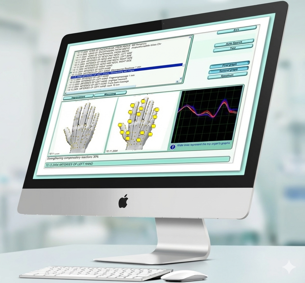 Newscan SWⅢは、からだ全体のバランスや自律神経の状態、ストレス傾向などを視覚的にわかりやすく確認できる測定機器です。画面には、からだの各部位やバランス状態がグラフィックで表示されるため、「今、自分のからだがどんな状態なのか」を直感的に理解することができます。